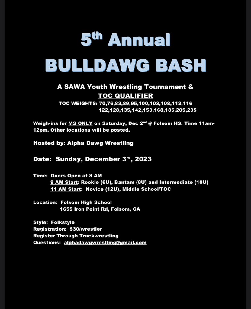 Durham will host a satellite weigh in for TOC qualifier tournament in Folsom. Please register on trackwrestling prior to weigh in. We will be at the Chico location Saturday from 12:00-1:00. Questions please contact Coach Bob Hotchkiss. (530) 354-1969.