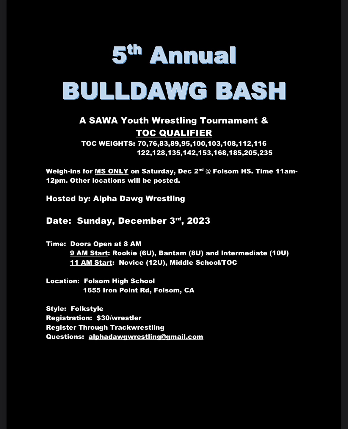 Durham will host a satellite weigh in for TOC qualifier tournament in Folsom. Please register on trackwrestling prior to weigh in. We will be at the Chico location Saturday from 12:00-1:00. Questions please contact Coach Bob Hotchkiss. (530) 354-1969.